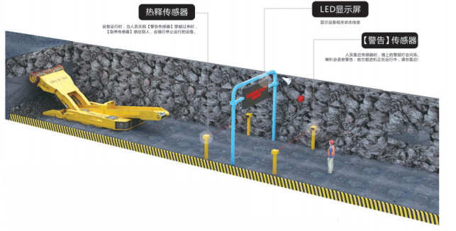 通过在掘进机后10-20米位置安装两道热释传感器,综掘机机载语音播报的形式对人员误入危险区域的情况进行报警,知到掘进机司机及误入人员。危险区域划分为预警区域和报警区域,预警区域的距离大于报警区域的距离。